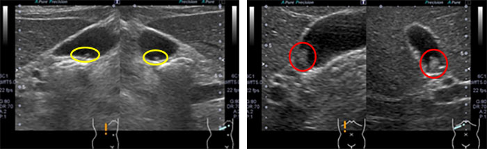 右:大きめの(7~8mm)胆嚢ポリープ(赤〇)